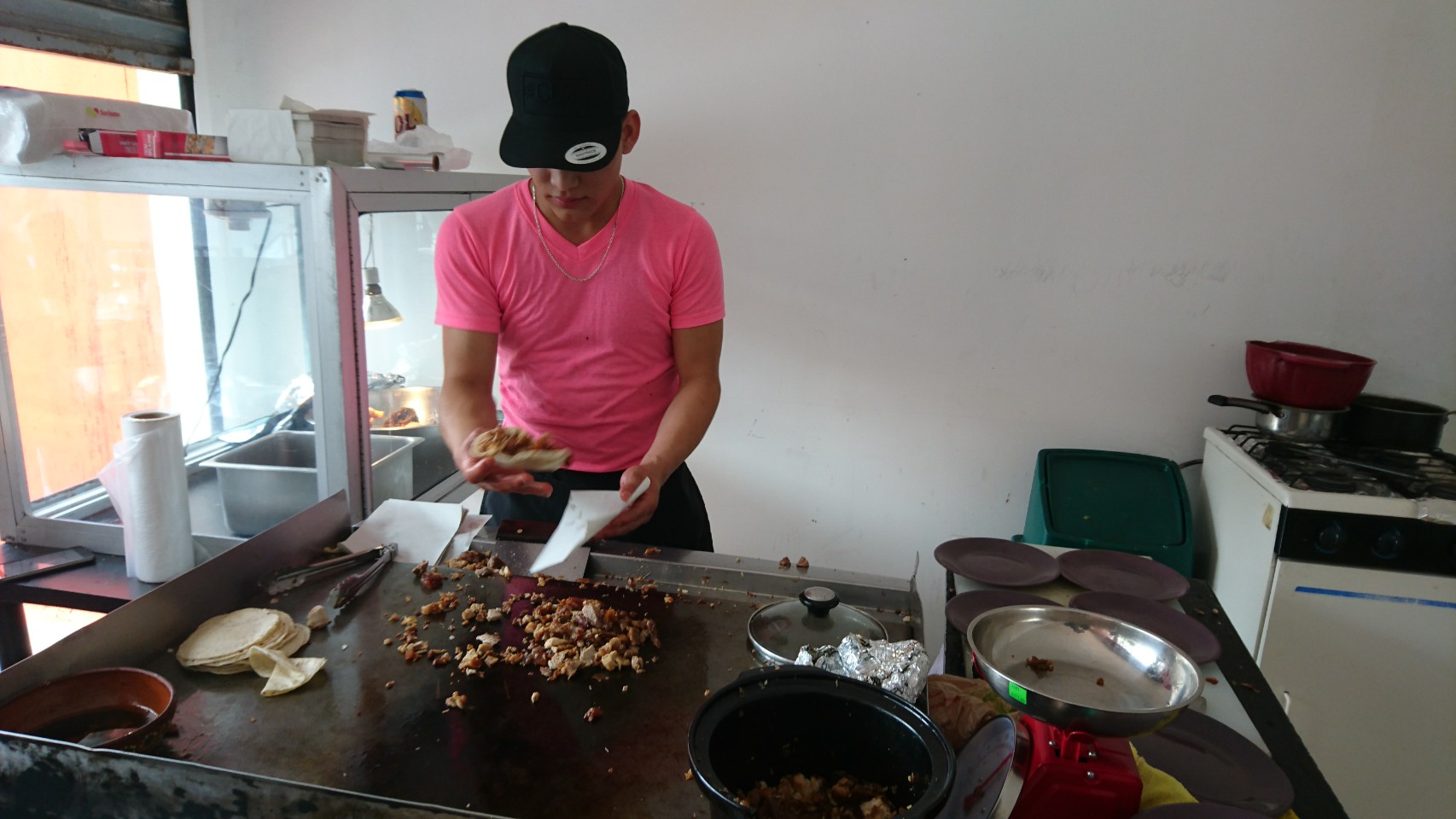そしてランチは現地メキシカンワーカーの方々と一緒にタコスランチの予定としているようで、買い物ついでにサルバドールとお店を予約。今日はサルバードルのチョイスでCarnitas Tacosのタコスタンドの店。Carnitas(カニータス)とは豚肉のタコスで、個人的にめっちゃ好きなのでラッキーとばかりに気持ちもあがる。サルバドール、GOOD JOB!(笑)
