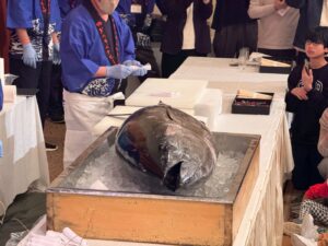 約80kgの巨大本マグロが、神輿に乗って会場に現れた瞬間。湧き上がった拍手と歓声が、今でも耳に焼き付いています。